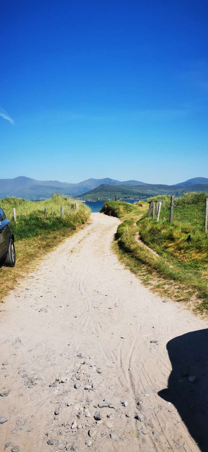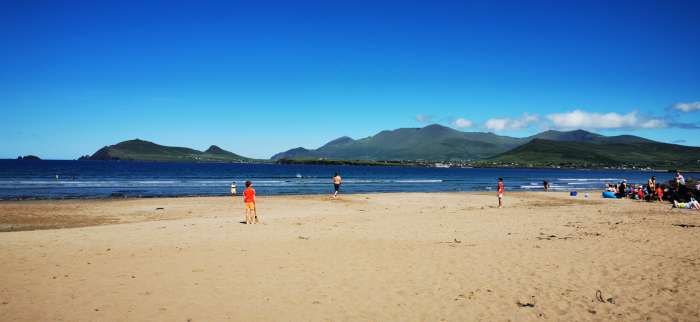 A tranquil pebble beach with a touch of sand, safe shallow waters ideal for kids to swim and paddle. The stunning beauty of the Dingle Peninsula and Inch Beach are visible across the water.
